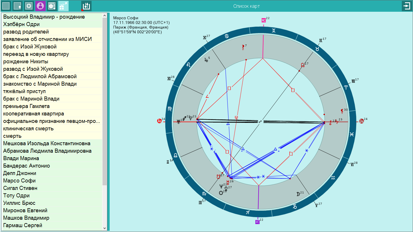 - multi-modes ("One event - many instruments", "One instrument - many events") - allows you to work simultaneously with many charts and tools. You can display up to 9 charts at the same time. Different modes are used both in rectification, and in prognostication;