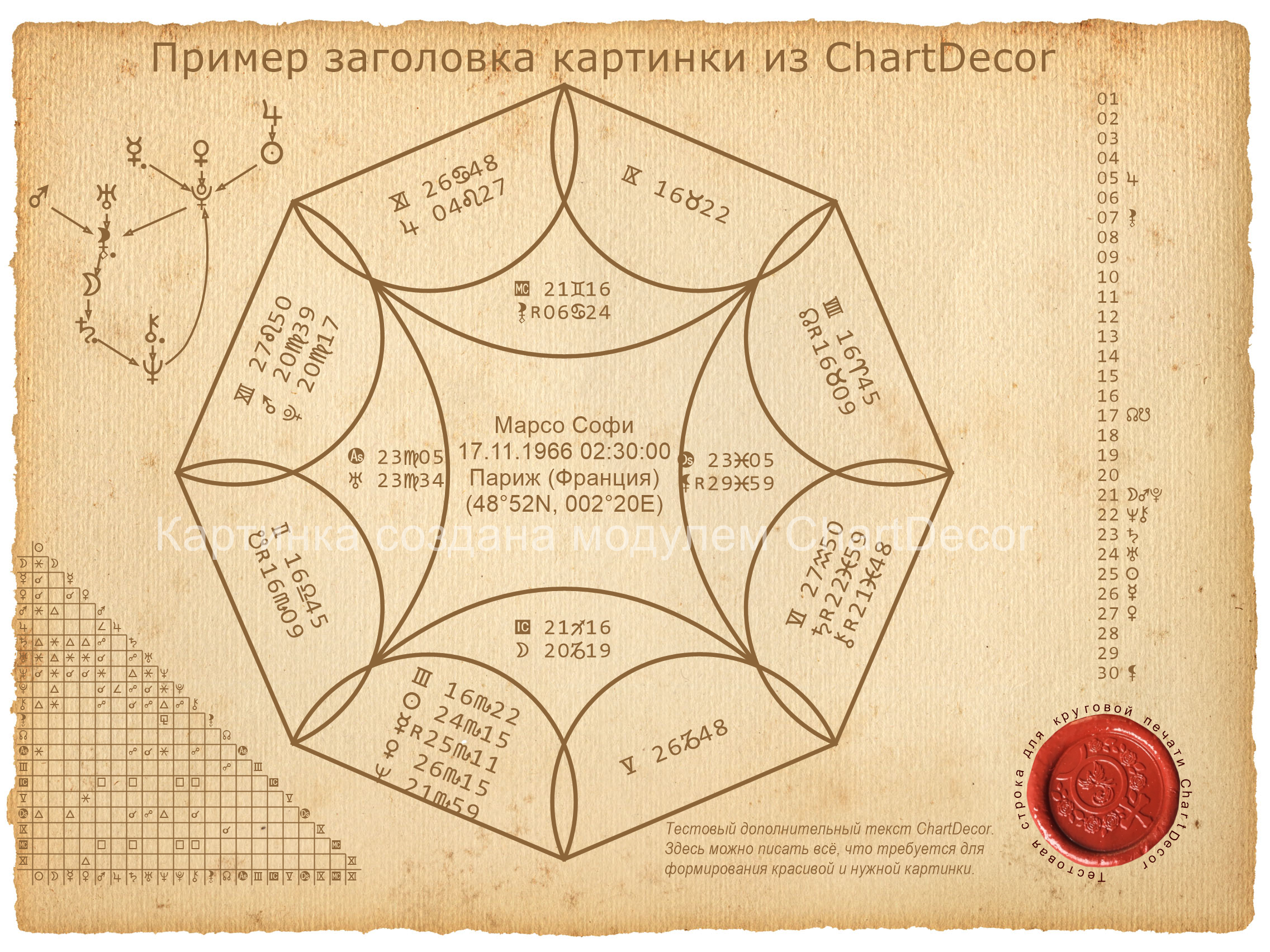The module is a specialized graphic editor for raster and vector graphics with databases of background images, seals and chart types for decorating astrological charts. Decorating means "decorating" and preparing gift pictures with various astrological types of charts (from rarities to modern ones), tables of aspects, chains of dispositors and thirty-degree indicators. Prepared images are saved in TIFF format, which provides high quality files for subsequent printing on large sheets of paper. See screenshots of the ChartDecor module.