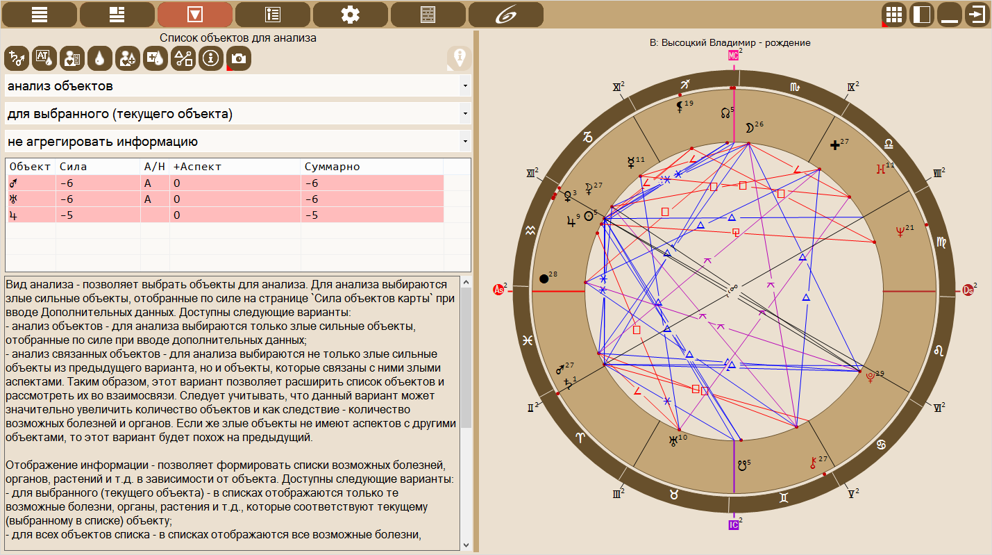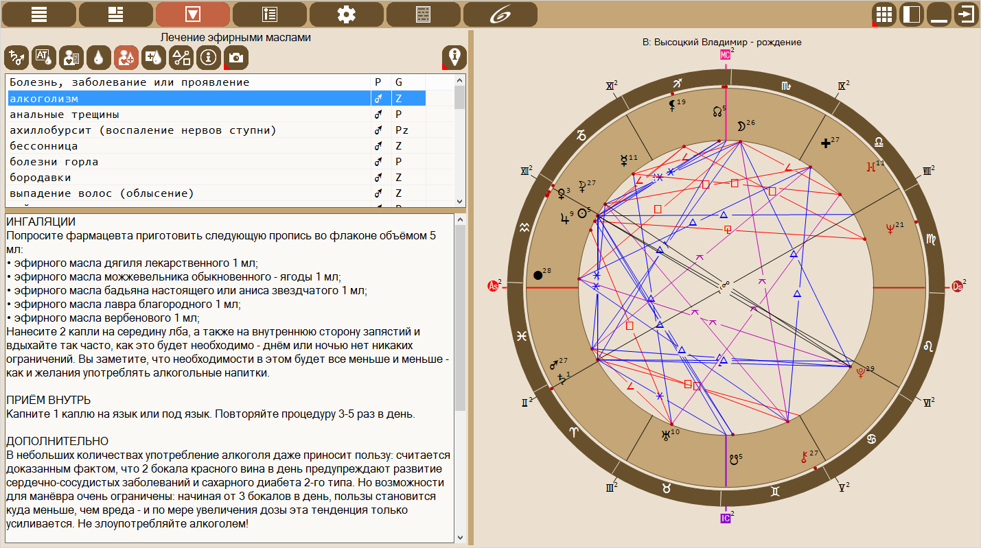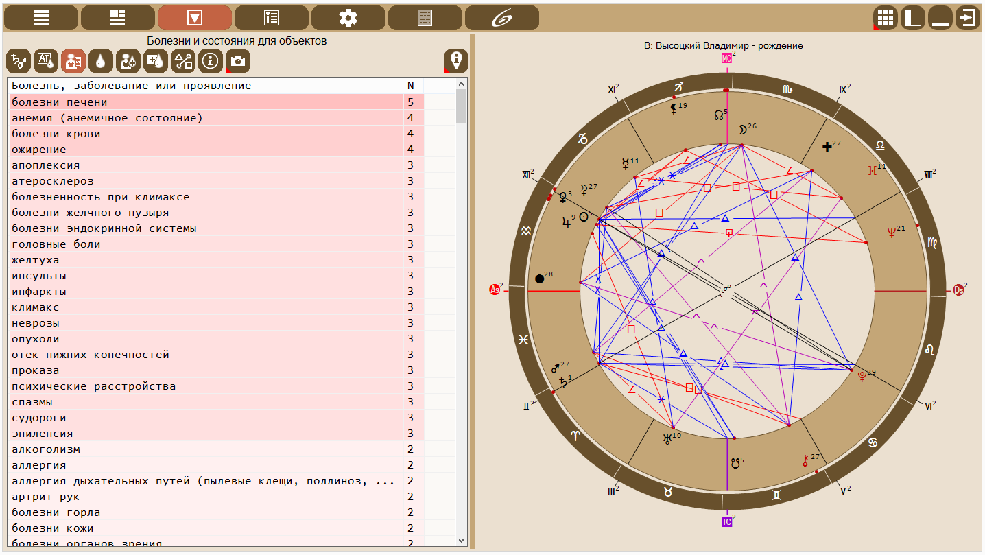 - automatic aggregation of information on organs and diseases, depending on planets, signs, houses, and aspects;