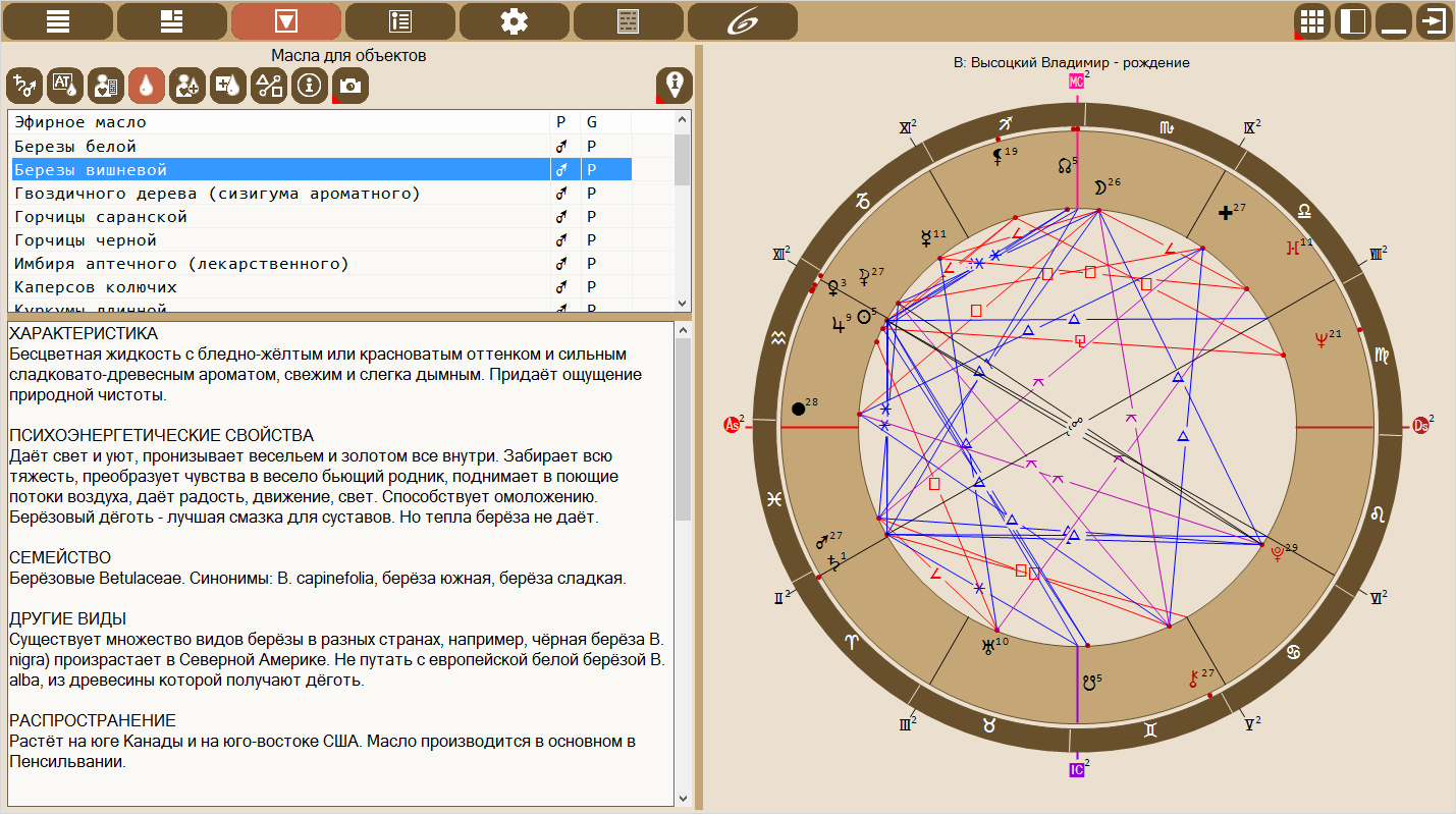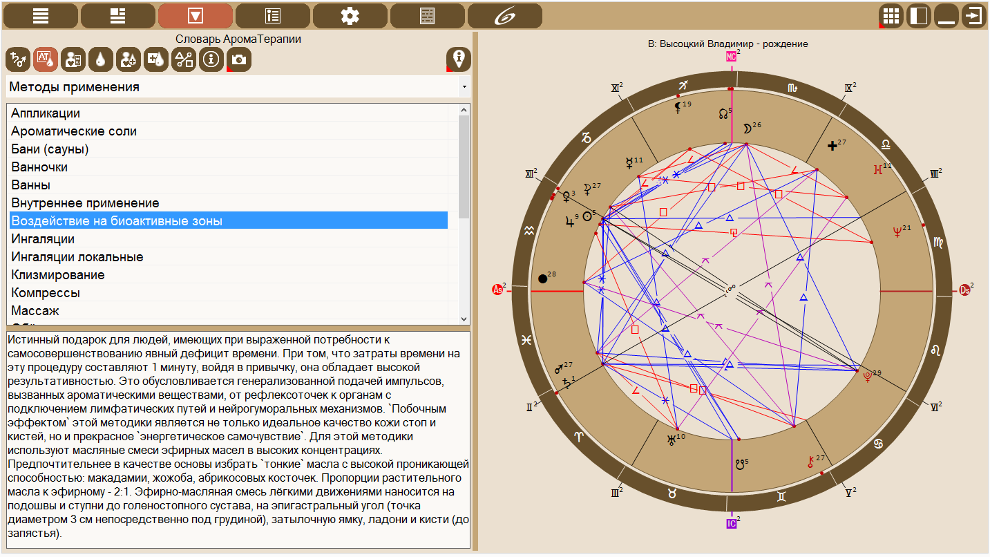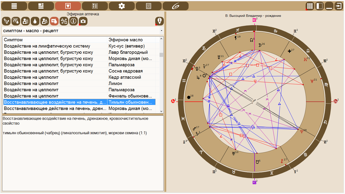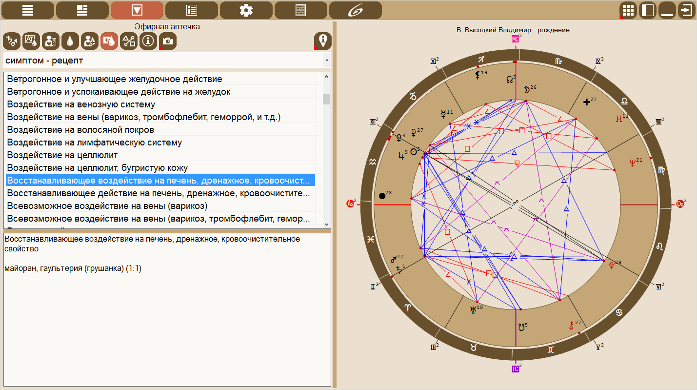 - automatic aggregation of information on organs and diseases, depending on planets, signs, houses, and aspects;