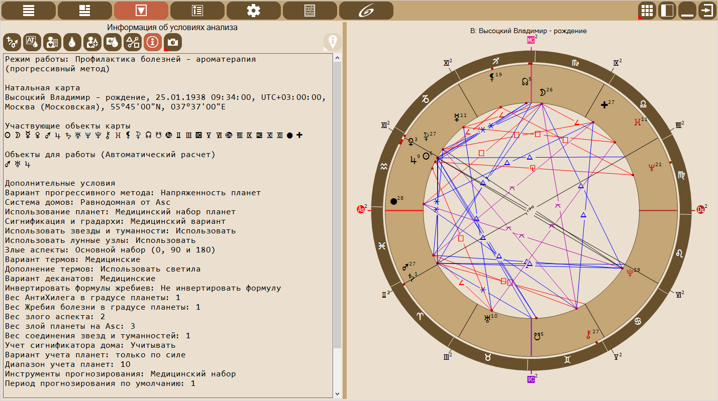 In MedicalPoint, as in Horus, different directions and methodologies of medical astrology are squeezed into a Procrustean bed, so that everyone can work with the material familiar to them. Combining incompatible things is quite difficult, but with the help of additional settings this became possible.